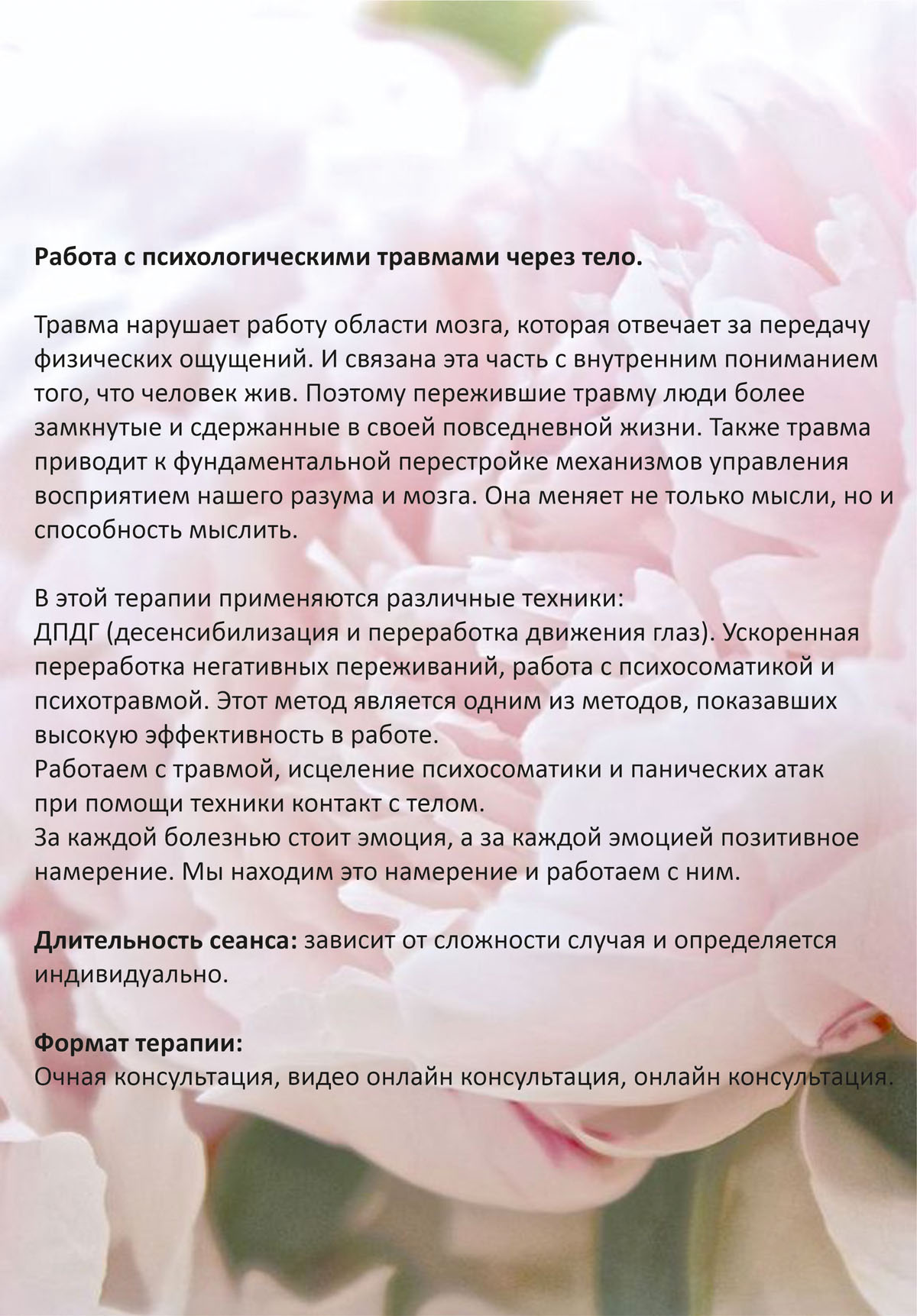 Длительность сеанса: зависит от сложности случая и определяется индивидуально.