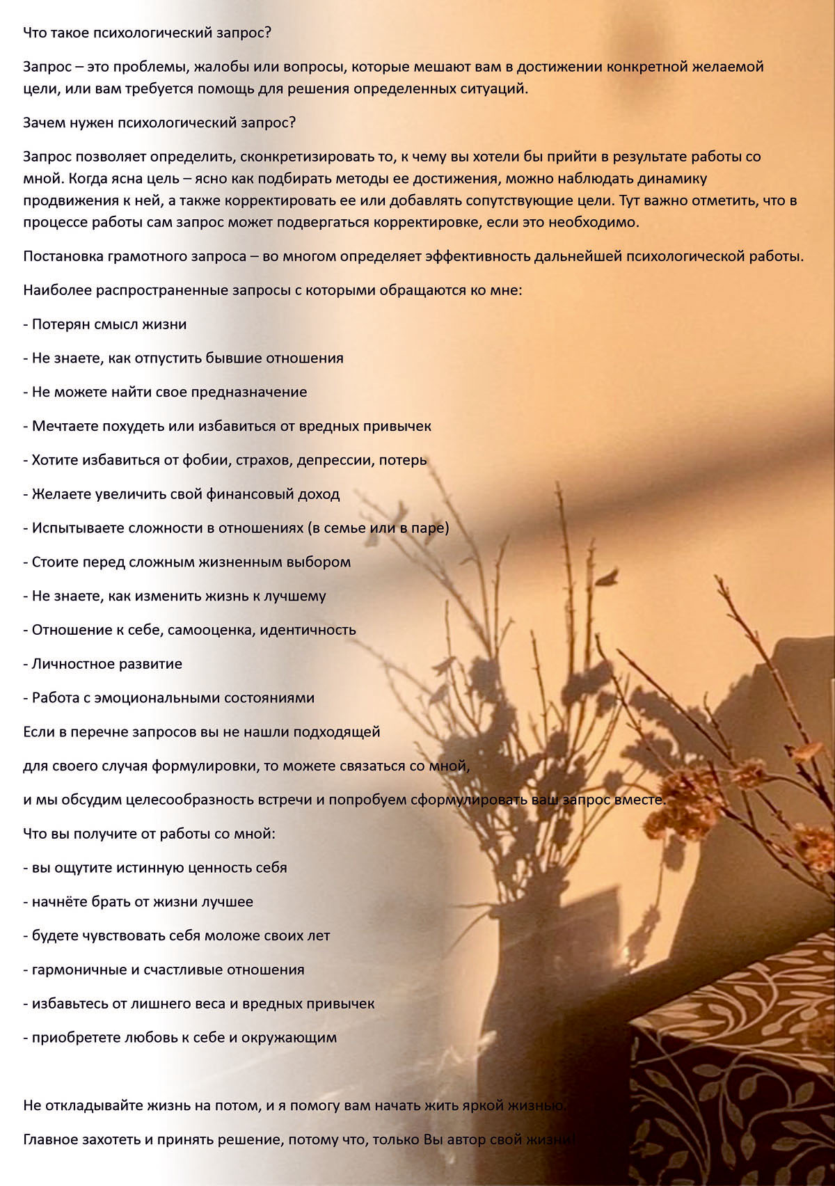 Запрос позволяет определить, сконкретизировать то, к чему вы хотели бы прийти в результате работы со мной. Когда ясна цель – ясно как подбирать методы ее достижения, можно наблюдать динамику продвижения к ней, а также корректировать ее или добавлять сопутствующие цели. Тут важно отметить, что в процессе работы сам запрос может подвергаться корректировке, если это необходимо.